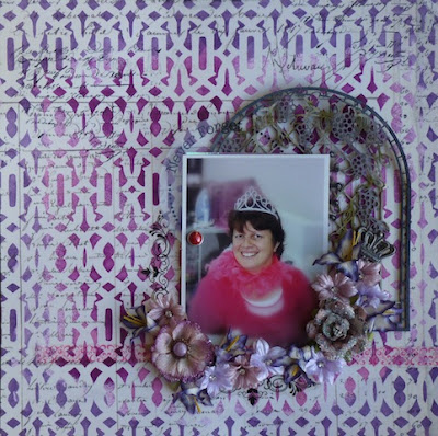 In the following layout I have sprayed the Pink Paislee paper with Wild Plum and Purple Twilight colour washes. Then I have added a Dusty Attic Chipboard trellis window, Prima flowers and a hidden title.